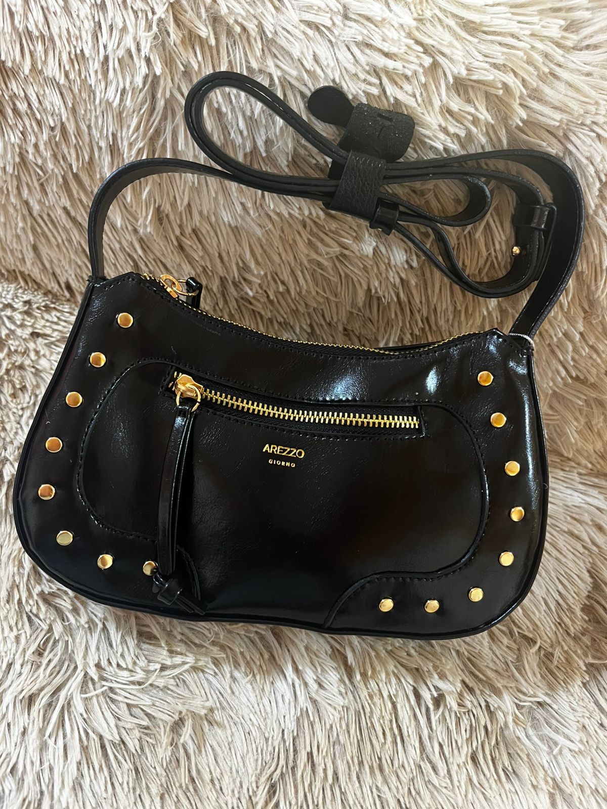A Bolsa Arezzo Tiracolo Média com Tachas combina charme, praticidade e design moderno em uma única peça. Feita em material sintético de alta qualidade, possui acabamento em verniz com textura lisa e detalhes em tachas metálicas douradas que adicionam um toque urbano e sofisticado ao visual. Seu formato curvado traz leveza e feminilidade, enquanto o zíper frontal e as costuras reforçadas garantem segurança e funcionalidade.