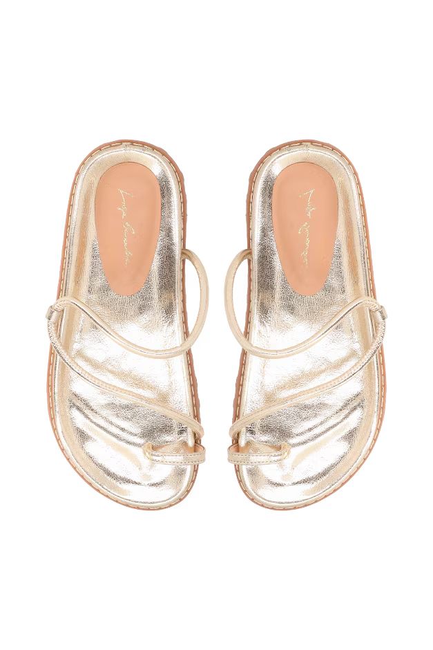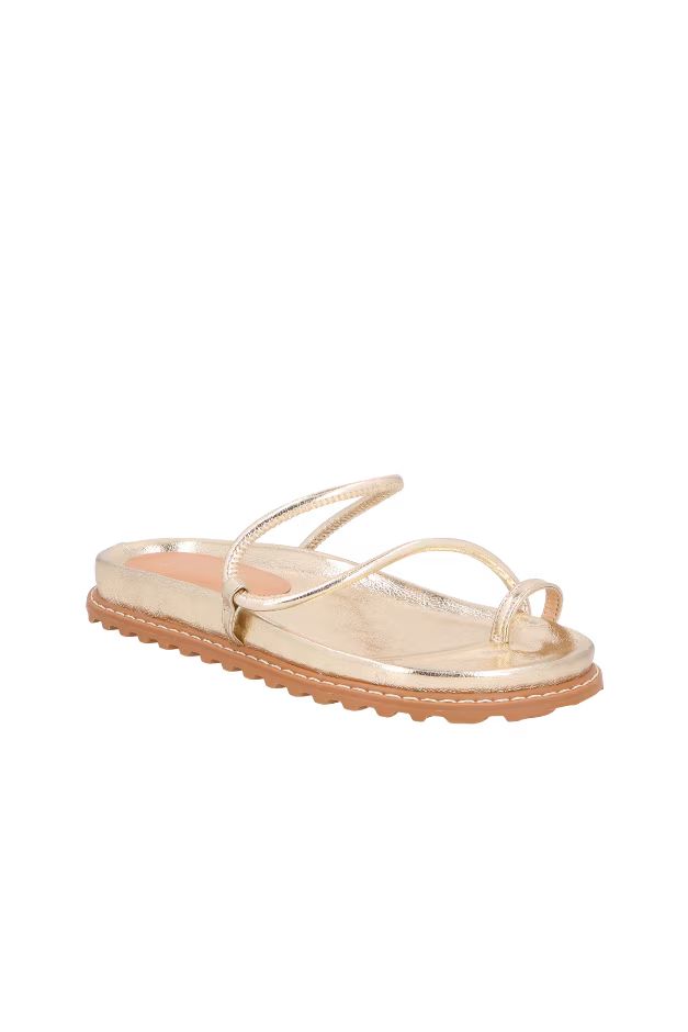 Papete de dedo com tiras finas assimétricas em material tecnológico no tom metalizado dourado, que adiciona brilho sofisticado e toque contemporâneo. O solado tratorado oferece conforto e aderência, enquanto o design minimalista das tiras traz leveza e modernidade ao visual.
