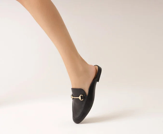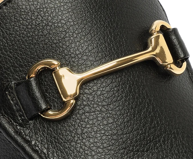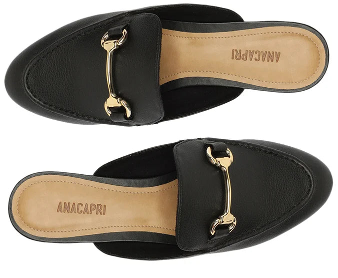 Mule Bridão Essencial Preta. Possui bico arredondado e aplicação de bridão metálico na gáspea. Palmilha nude com o nome da marca. Deixa calcanhar à mostra.
