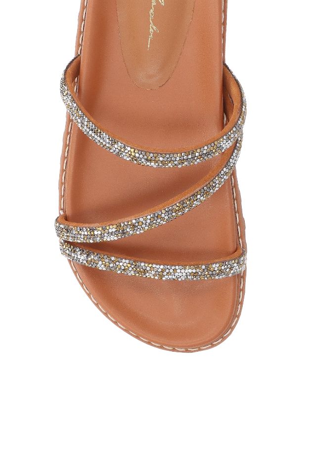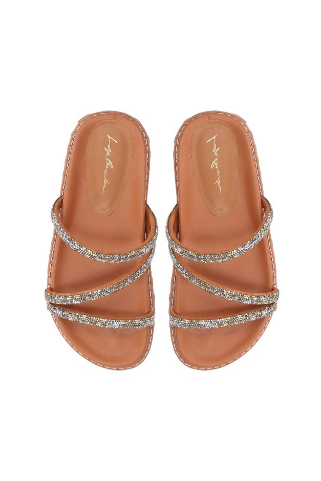 Com mood casual e acabamento sofisticado, a papete em couro no tom de caramelo combina tiras finas com aplicação de cristais que trazem brilho e leveza às produções. O design clean valoriza os pés, enquanto o solado levemente tratorado garante conforto e personalidade. Um modelo versátil que eleva o visual com elegância.