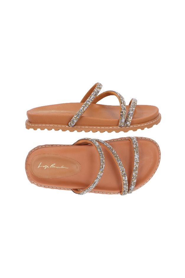 PAPETE DE TIRAS FINAS EM COURO CARAMELO COM APLICAÇÃO DE CRISTAIS