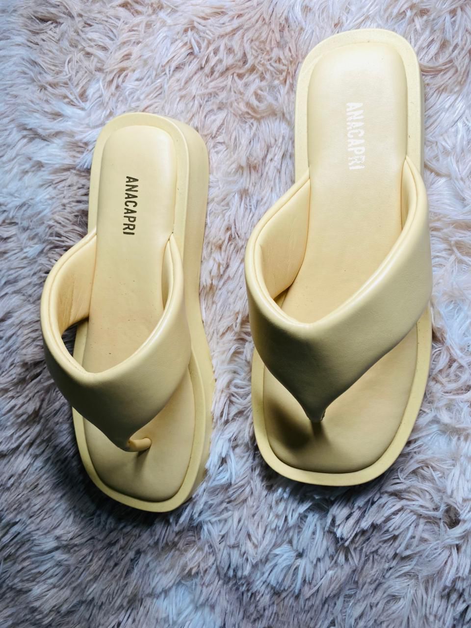 Papete Nina, na cor marrom. O modelo de material similar ao couro traz biqueira moderna quadrada. De salto flatform baixo, possui cabedal com tira única e central mais larga - com efeito acolchoado na gáspea e design triangular, que separa os dedos. Aberta atrás, a papete possui palmilha acolchoada com assinatura Anacapri.