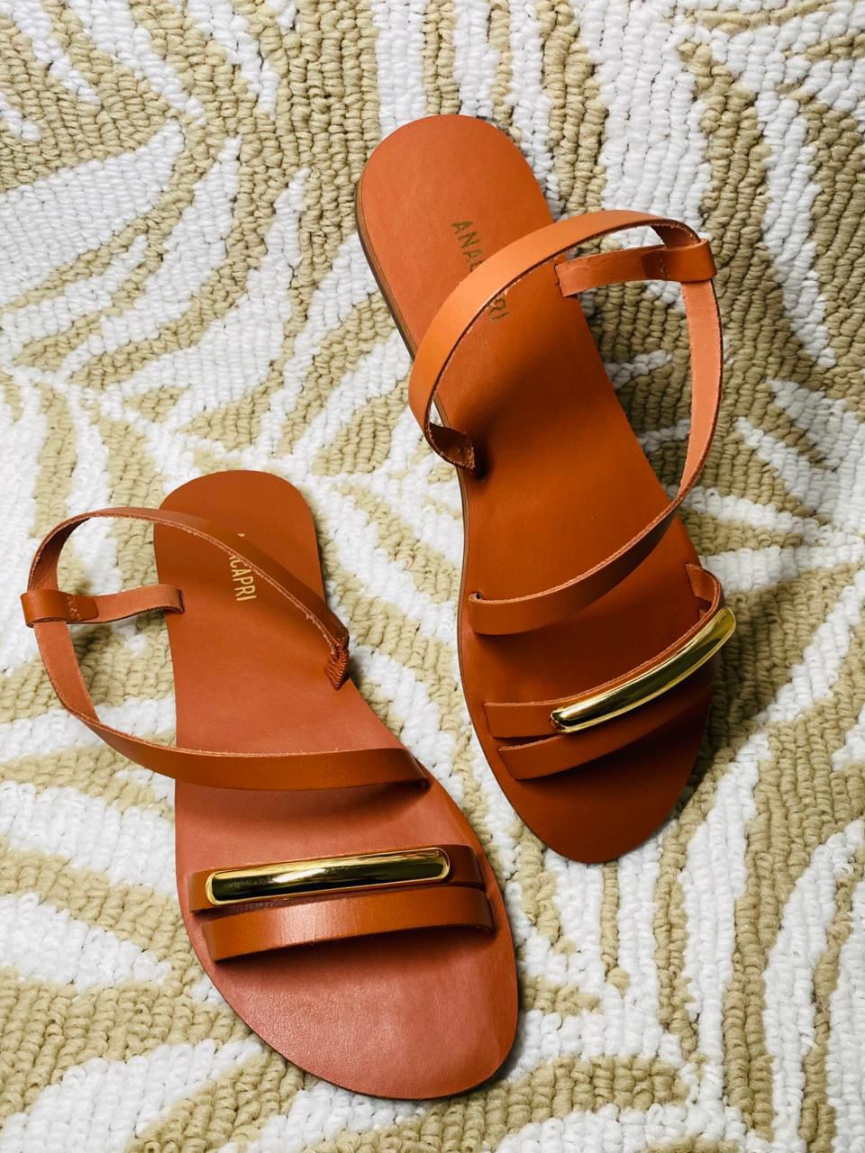 Rasteira de tiras finas com detalhe em metal, na cor marrom. De material similar ao couro e biqueira arredondada, possui solado emborrachado, com leve saltinho traseiro. O modelo traz cabedal com duo de tirinhas sobre os dedos, com aplicação de adorno metálico em uma das tiras. Possui outra tira elástica, que perpassa em curva no peito de pé presa na lateral - que passa pelo tornozelo, contornando o calcanhar pela lateral, facilitando o calce de encaixe. Traz palmilha no mesmo tom da rasteirinha, com assinatura Anacapri.