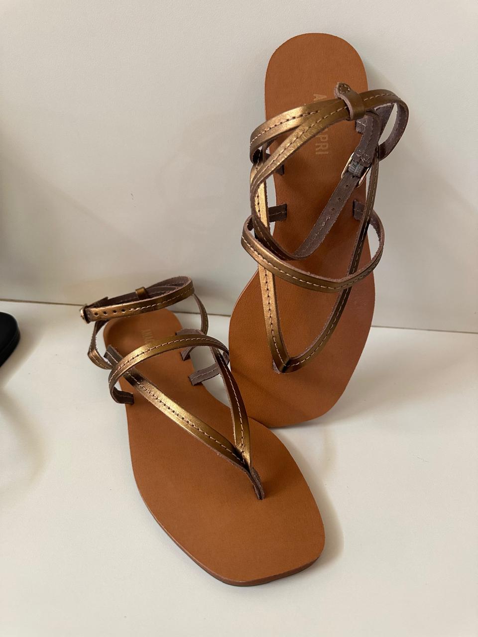 Rasteira multitiras em couro, com tiras em detalhe de pespontos, na cor marrom. O modelo possui solado rasteiro emborrachado com leve saltinho e biqueira e biqueira quadrada.Traz cabedal com tira central que passa entre os dedos e segue pelas laterais e outra tirinha sobre o peito de pé. Detalhe para costura pespontada e delicada no contorno das tiras. A rasteira traz tiras laterais traseiras que contornam o calcanhar e se conectam à tira no tornozelo, com fechamento superior em fivela lateral. Com palmilha comfy marrom e assinatura Anacapri