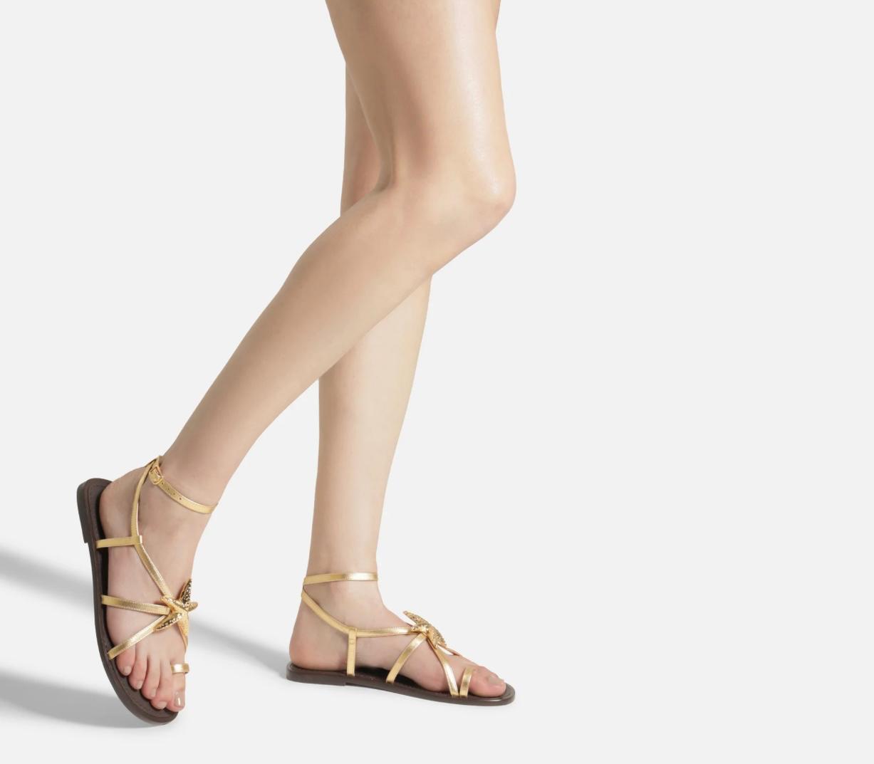 Sandália rasteira feminina dourada de couro. O sapato tem salto rasteiro e formato arredondado na ponta. Traz tira fina na parte superior do pé, com aplicação de metal em forma de estrela-do-mar, e tira em torno do dedão. Possui mais duas tiras finas que saem das laterais frontais, cruzam na parte superior do pé, contornam o tornozelo e fecham em fivela lateral. Com palmilha lisa e nome da marca.