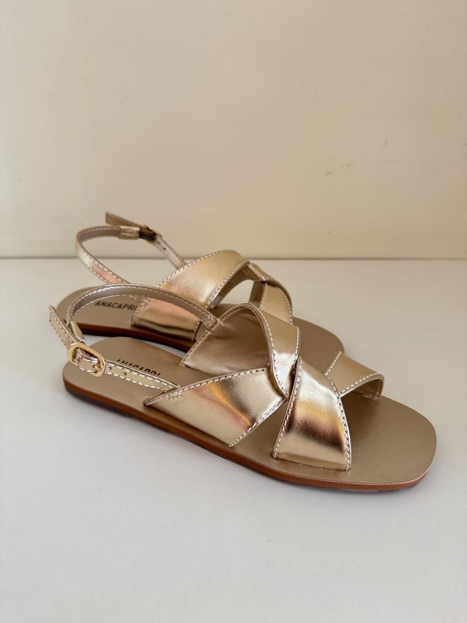 Rasteira entrelaçada com detalhe em pespontos, na cor dourada. O modelo de solado rasteiro emborrachado com leve saltinho, apresenta cabedal imponente com duas tiras largas entrelaçadas, com acabamento em pesponto delicado, que se cruzam sobre os dedos e peito de pé. Com fecho regulável em fivela lateral, por tiras fininhas que seguem pelas laterais e contornam o calcanhar. De biqueira moderna quadrada, traz palmilha acolchoada comfy com assinatura Anacapri.