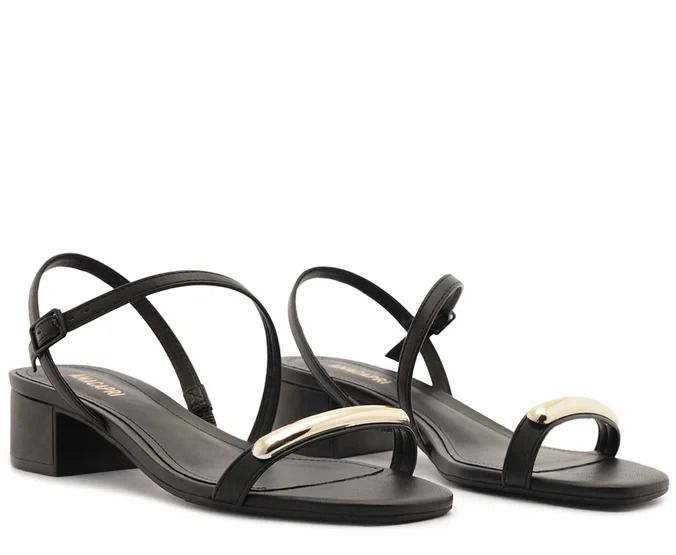 Sandália de salto bloco e tiras finas, com detalhe em metal, na cor preta. De material similar ao couro e biqueira quadrada, possui salto em bloco médio. O modelo traz cabedal com uma tira sobre os dedos, com aplicação de adorno metálico imponente. Possui tira elástica, que perpassa em curva no peito de pé pela lateral, em meia cana transversal - que passa pelo tornozelo, contornando o calcanhar pela lateral, com fecho afivelado. Possui palmilha acolchoada no mesmo tom da sandália, com assinatura Anacapri.
