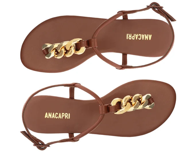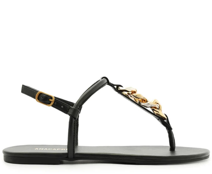 Rasteira slim, com detalhe em corrente, na cor preta. O modelo possui solado rasteiro e emborrachado, com leve saltinho traseiro. Com biqueira arredondada e em material similar ao couro, traz uma tira fininha sobre o peito de pé e uma central entre os dedos, com aplicação de maxi corrente metálica na gáspea. Na parte traseira, traz fecho em fivela regulável, contornando o calcanhar. Com palmilha comfy de mesmo tom da peça e assinatura Anacapri.