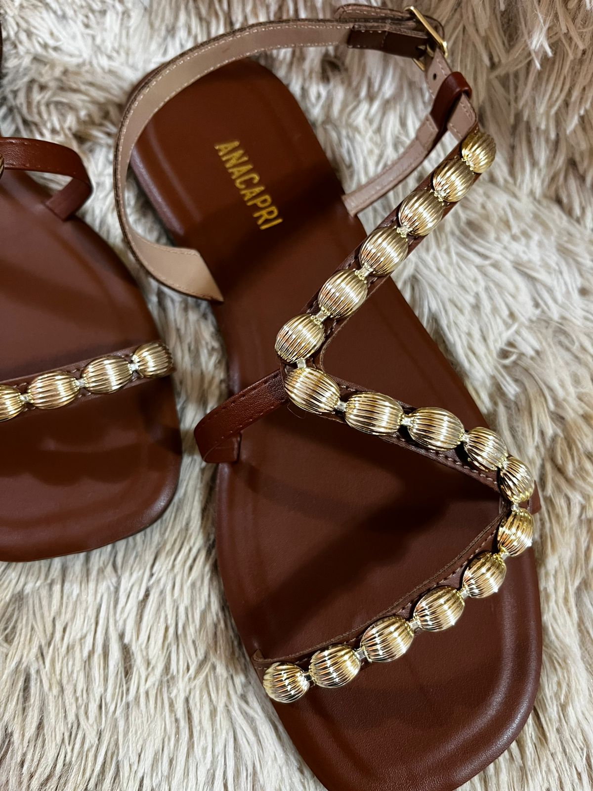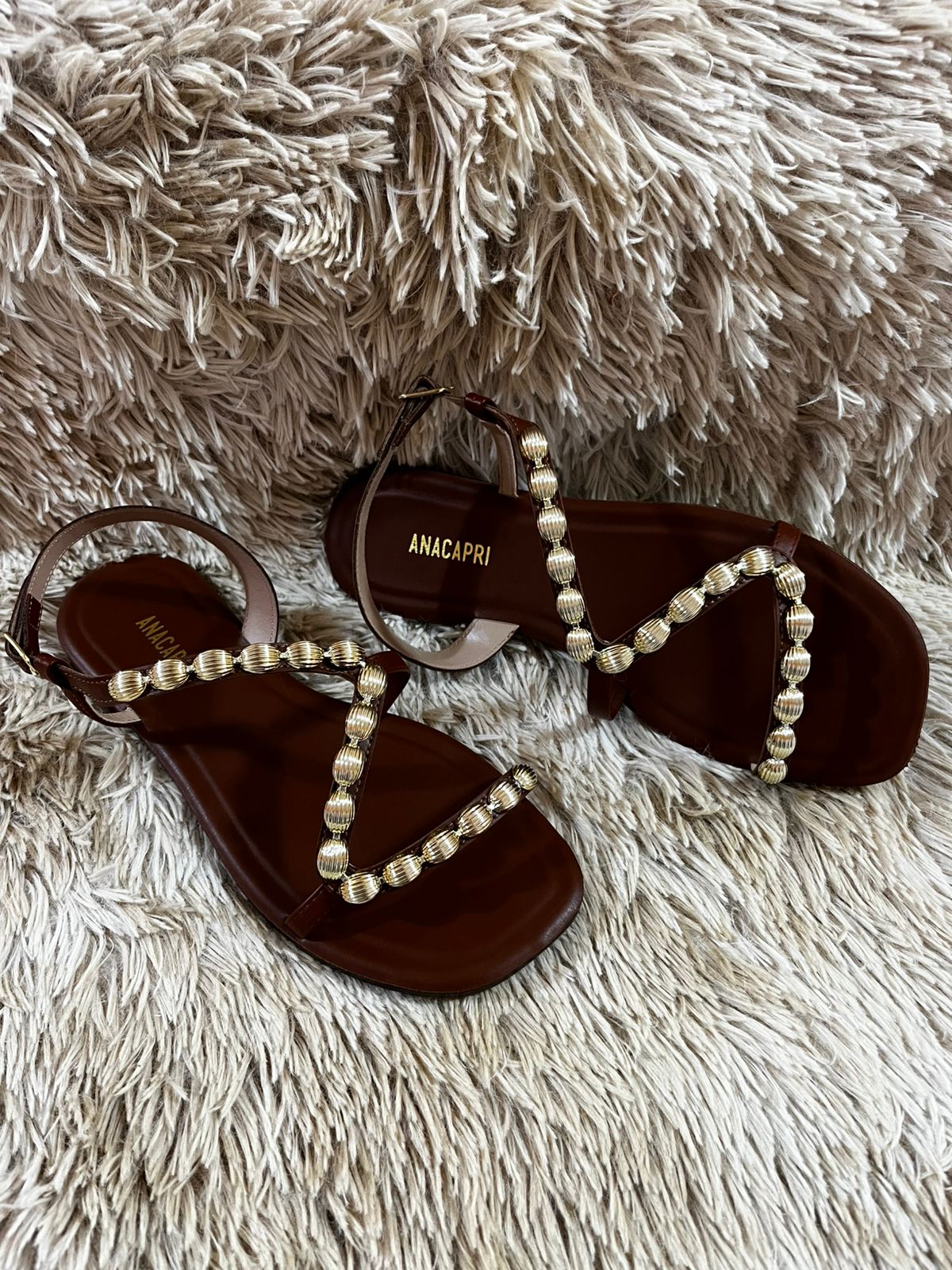 Sandália marrom, em material similar ao couro. O modelo possui solado rasteiro emborrachado e biqueira quadrada. O cabedal traz tira curva sobre os dedos, que segue pelo peito do pé até o tornozelo, com aplicação de pedrarias delicadas. Possui fechamento lateral em fivela metálica ajustável no tornozelo. A palmilha dourada apresenta assinatura Anacapri.