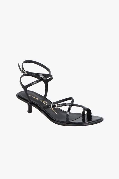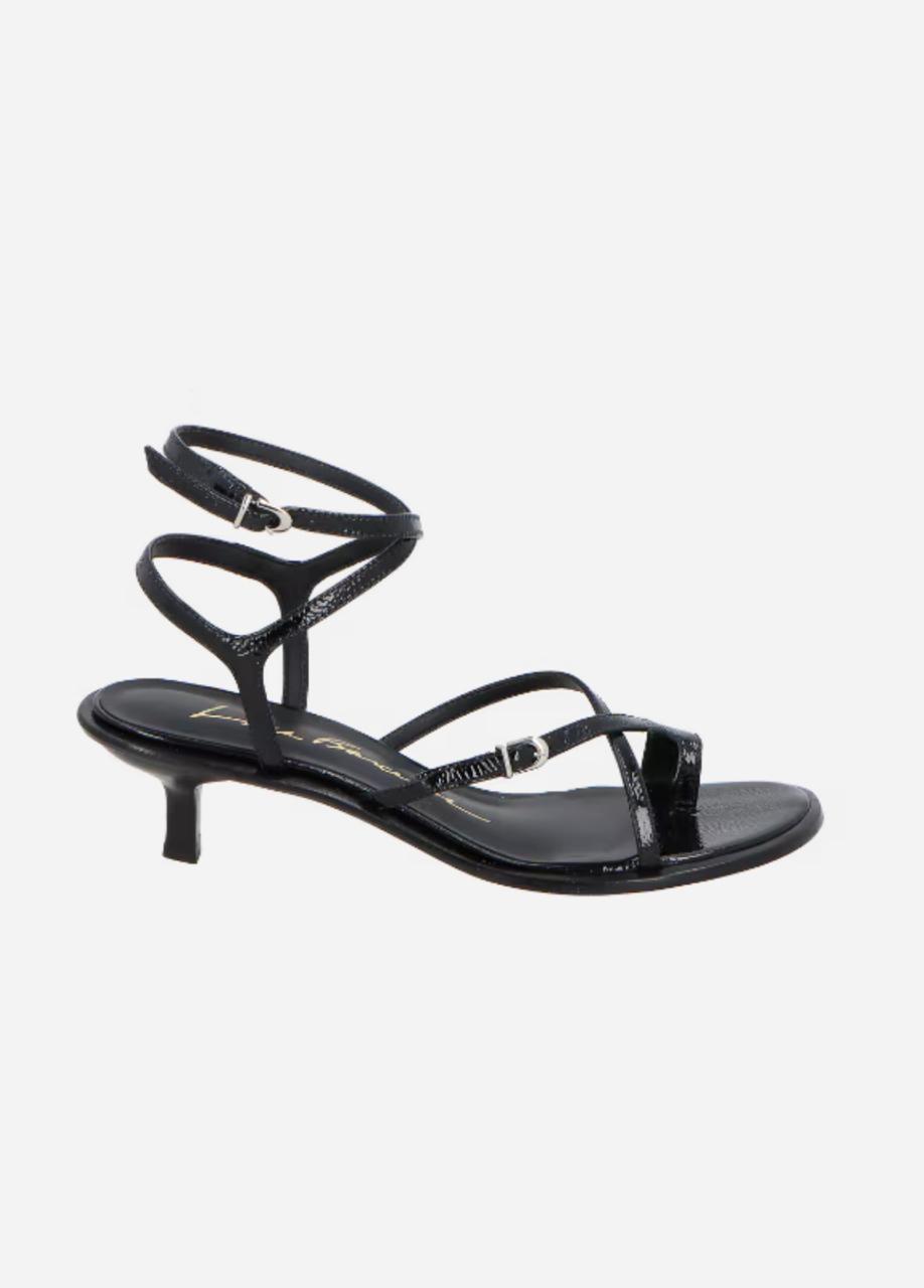 SANDÁLIA EM COURO VERNIZ PRETO COM SALTO BAIXO E TIRAS FINAS