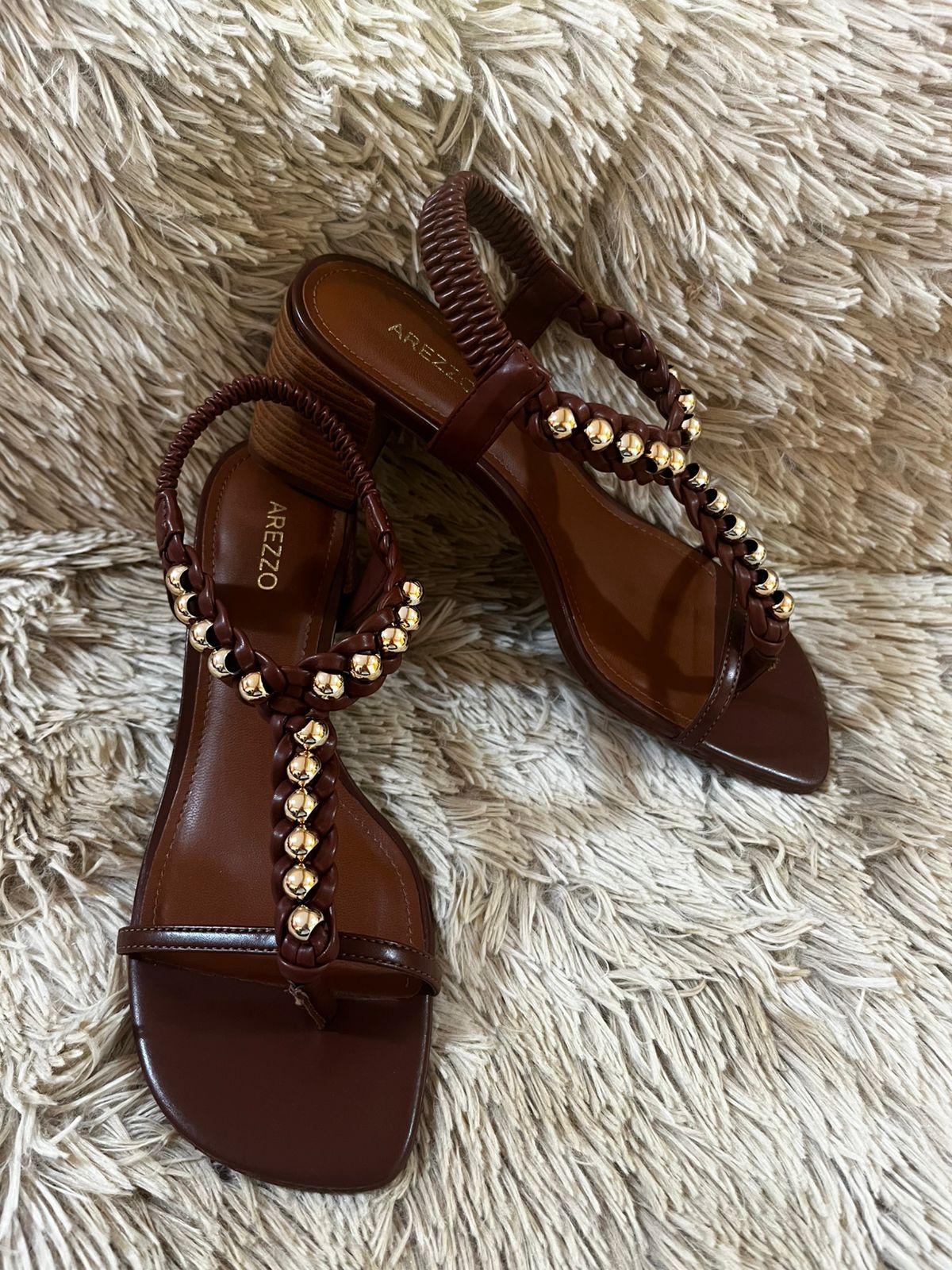 SANDALIA MARROM SALTO BAIXO ESFERAS METALICAS