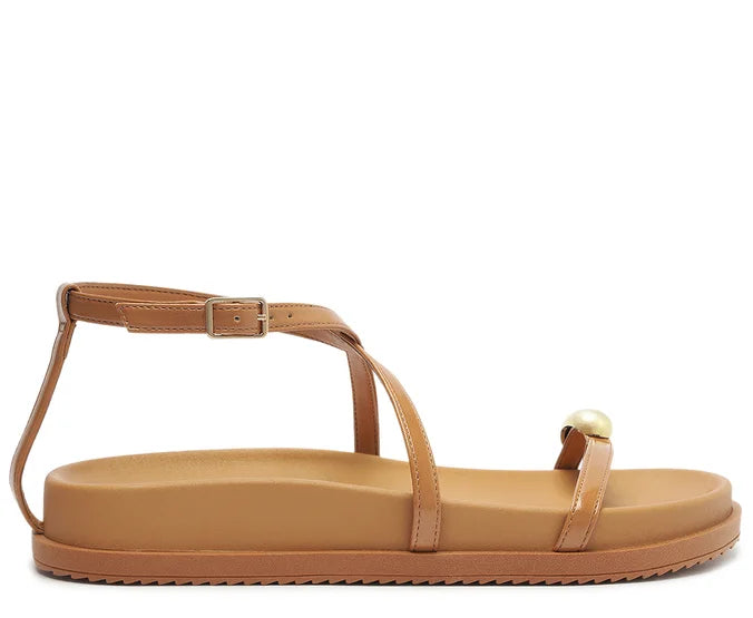 Papete, com detalhe em adorno e fechamento, na cor preta. O modelo de material similar ao couro traz cabedal com tirinha em diagonal que separa os dedos, com aplicação de maxi adorno redondo e metálico sobre o dedão. Apresenta duas tiras que se cruzam sobre o peito de pé e contorna o tornozelo - com fecho afivelado lateral - conectada na tira única do calcanhar. De biqueira arredondada, possui solado rasteiro emborrachado e tratorado, com palmilha anatômica e assinatura Anacapri.