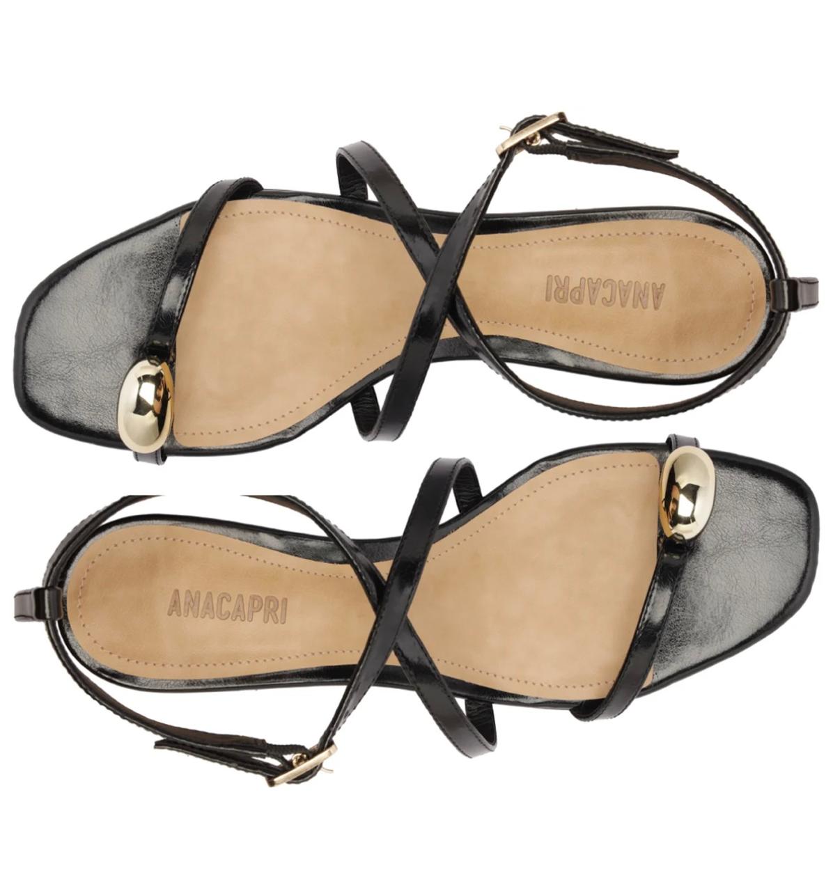 Sandália de tiras e salto bloco, com detalhe em adorno, na cor preta. O modelo de material similar ao couro apresenta salto em bloco médio. De biqueira quadrada, traz cabedal com tirinha em diagonal que separa os dedos, com aplicação de maxi adorno redondo e metálico sobre o dedão. Apresenta duas tiras que se cruzam sobre o peito de pé e contorna o tornozelo - com fecho afivelado lateral - conectada na tira única do calcanhar. Possui palmilha comfy no mesmo tom da sandália, contornada em pespontos, com assinatura Anacapri.