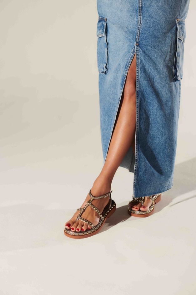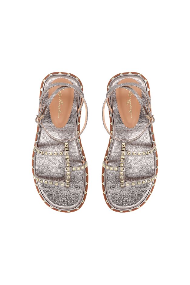 O design assimétrico das tiras, com suas posições propositalmente desencontradas, confere ao modelo uma aura imponente e robusta, complementada perfeitamente pelos studs em ouro velho. O tom chumbo harmoniza perfeitamente com as fivelas decoradas por pirâmides