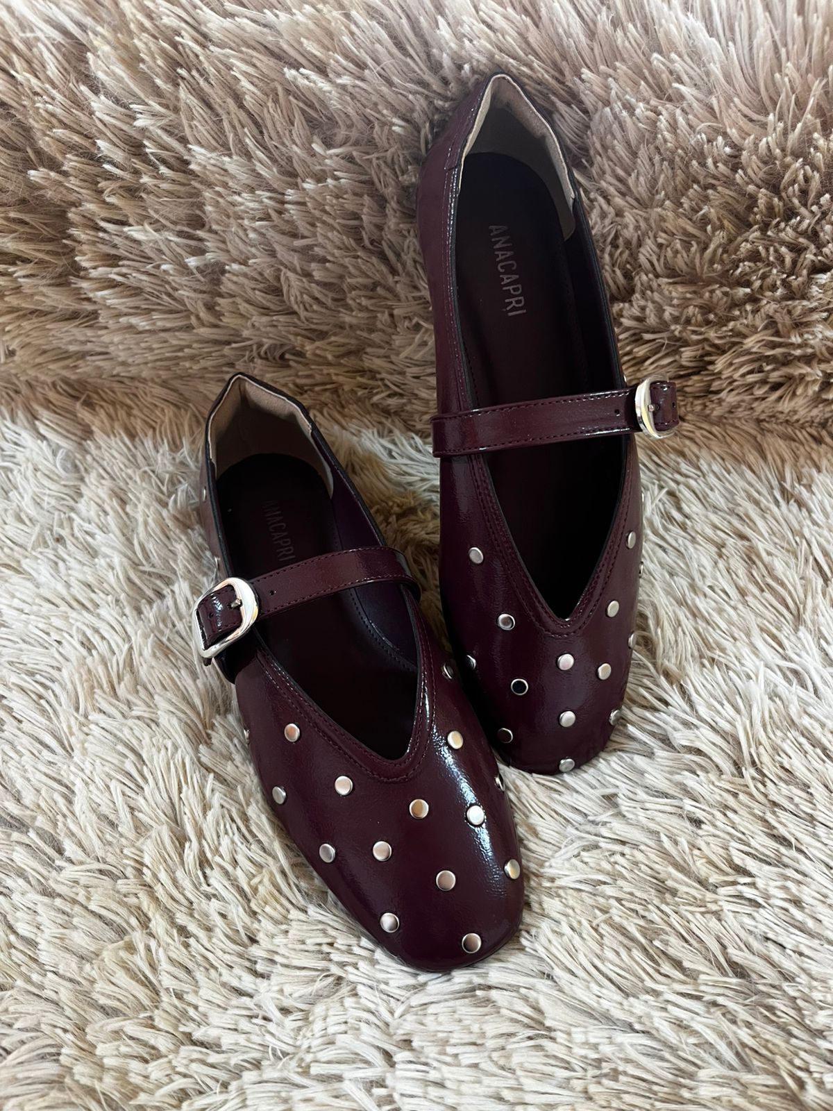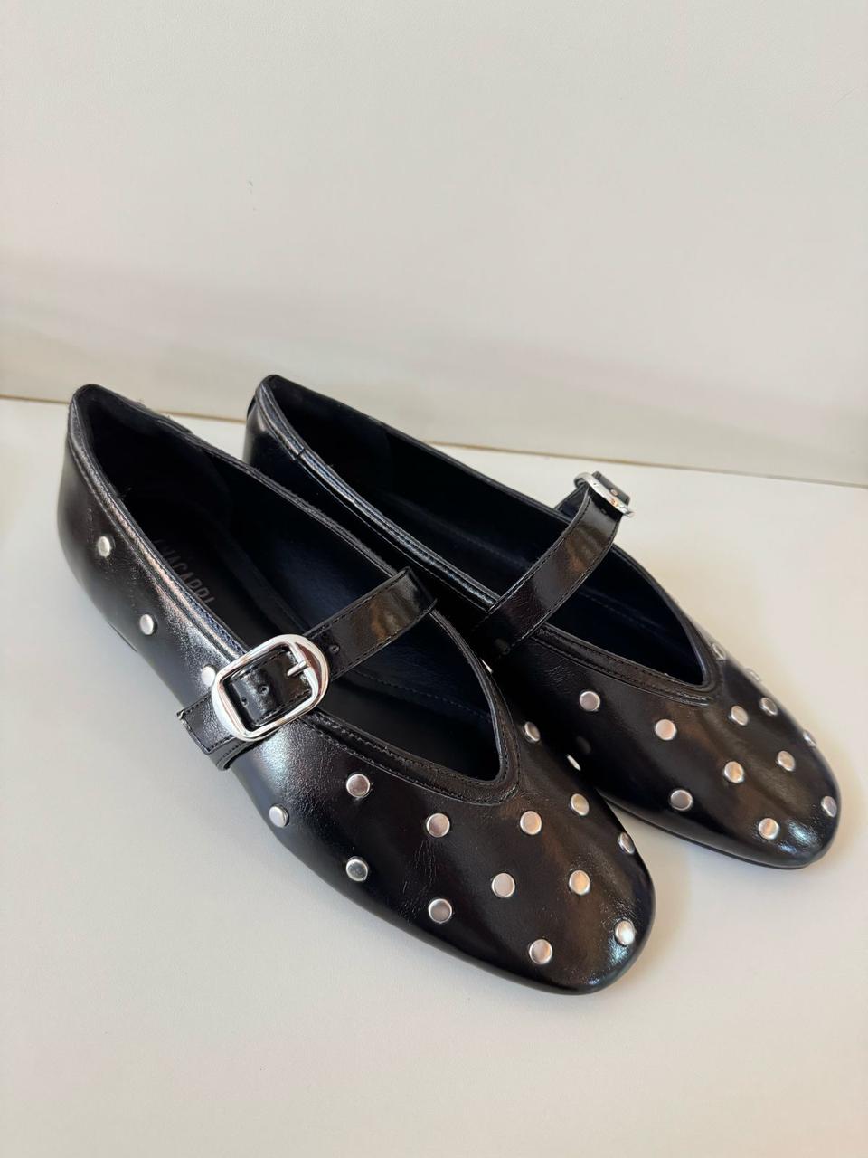 Sapatilha com tira única e aplicação de tachas, na cor preta. O modelo - estilo boneca - possui solado rasteiro e emborrachado, com leve saltinho traseiro e biqueira arredondada. Traz cabedal em material similar ao couro com efeito envernizado - com recorte arredondado sobre o peito de pé e contorno em fita no mesmo tom da peça. Detalhe para aplicação de tachas metálicas. Fechada, traz tira média afivelada - redonda e metálica - com regulagem sobre o peito do pé. Com palmilha confortável no mesmo tom da sapatilha e assinatura Anacapri em carimbo metálico.
