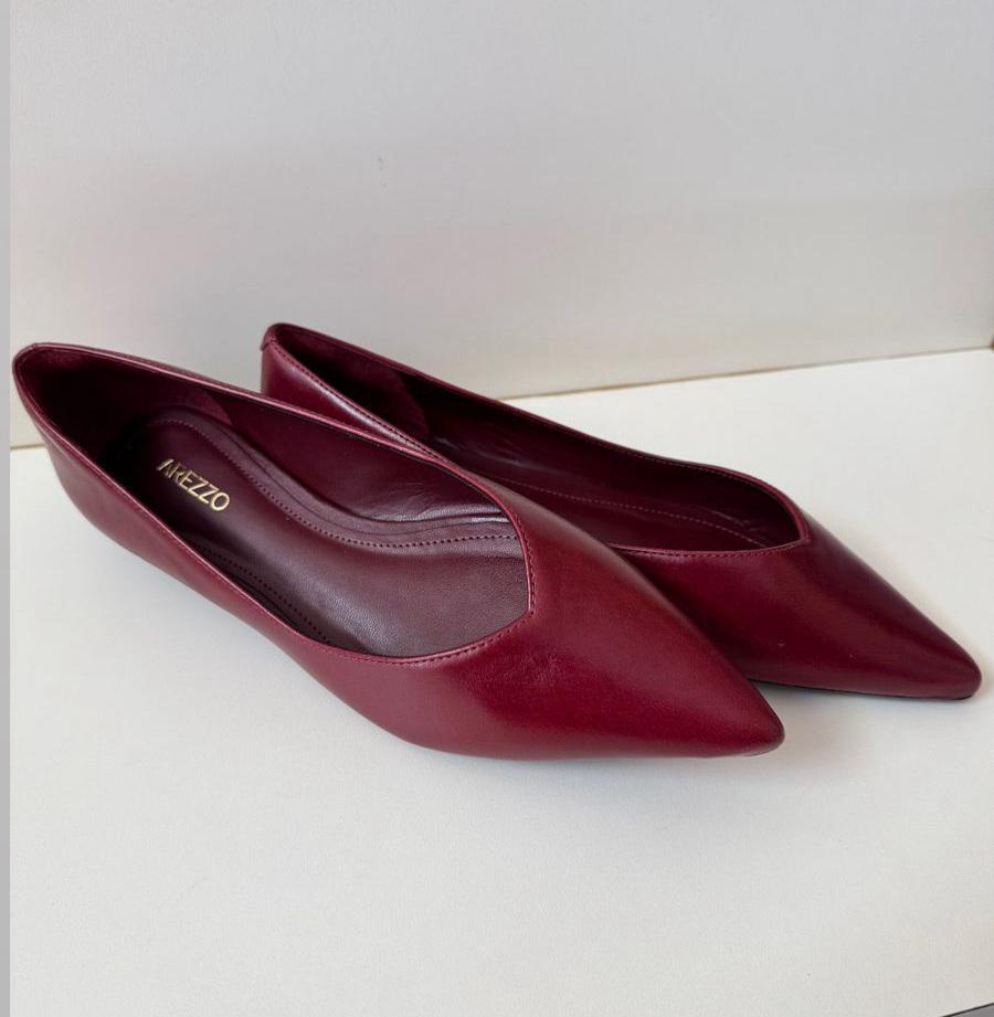 Sapatilha femininade couro. O sapato tem salto mínimo bloco e ponta fina. Fechada, traz recorte em V na parte superior do pé e formato ajustado nas laterais. Com interno preto e inscrição do nome da marca. Exibe toda a parte superior do pé
